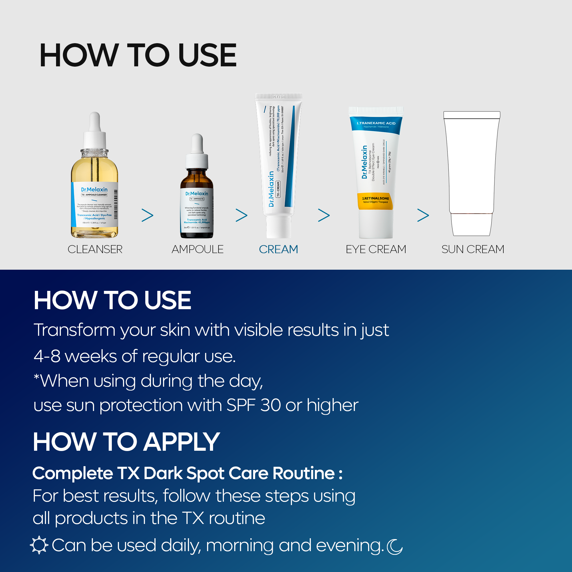 | Choose | Tx Radiance Complete Set(Tx Ampoule + Cleanser + Cream + Toner + Tx Eyecream), Tx Total Dark Spot Care Set(Tx Ampoule + Cleanser + Cream + Toner) |
